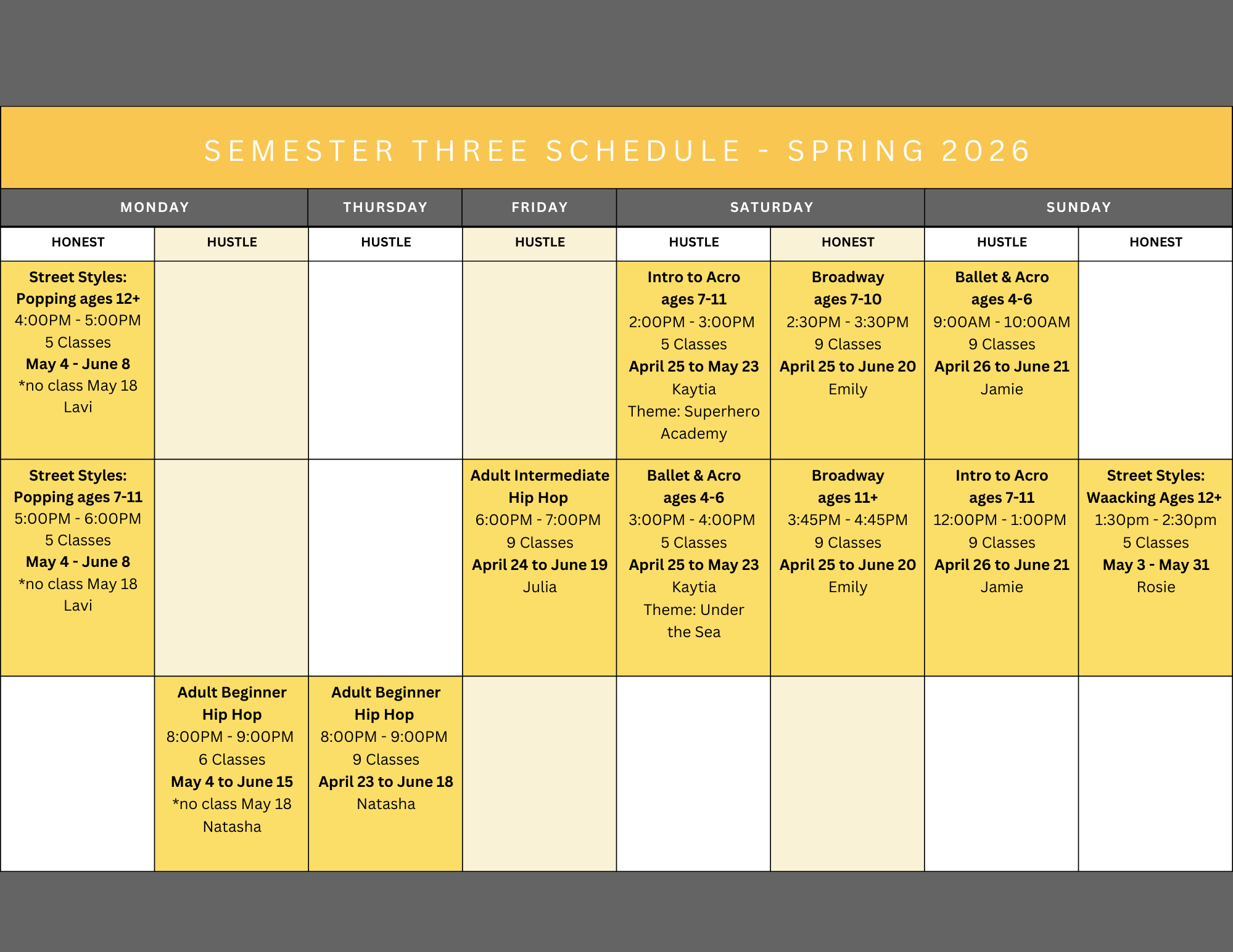 All other classes are Full Season Classes, run from September to June as a 10 month commitment preparing for our year end production.