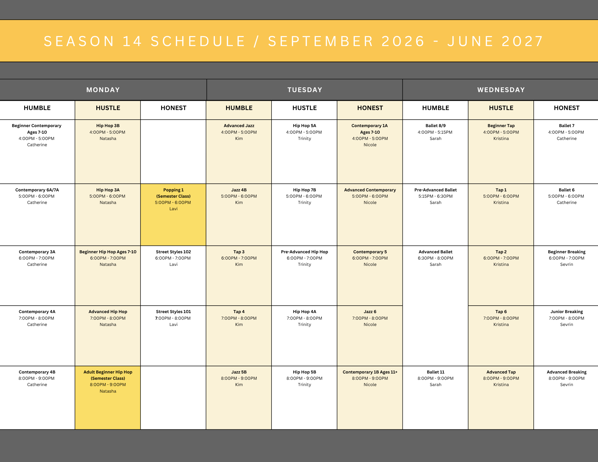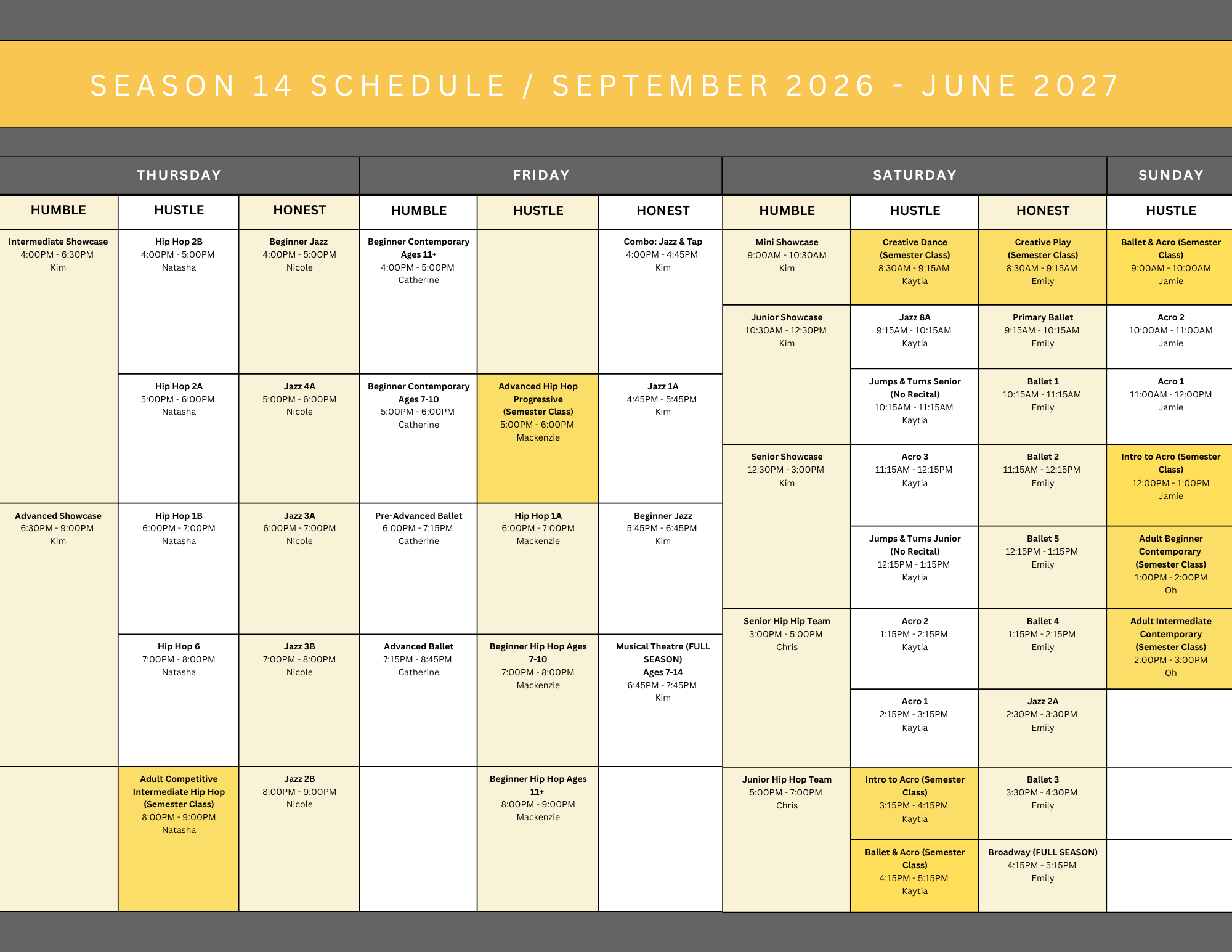 Season 14 Schedule Registration for Season 14 opens Friday, May 1st for current dancers! Register Register